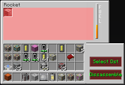 Once your rocket is assembled, you can right click to interact with it. In top left of the GUI you can see all the storage items loaded on the rocket including chests*, satellite bays and the guidance computer. Clicking on any of these icons will bring up that block's GUI and you can interact with it. On the right is the fuel gauge. On the bottom right are two very important buttons. The "Select DST" button is for flight and brings up the map of the solar system allowing you to choose a possible destination for the rocket. You will need more preparation before you can take off, so don't get trigger happy yet. The "Disassemble" button allows you to disassemble your rocket back into just a bunch of blocks.